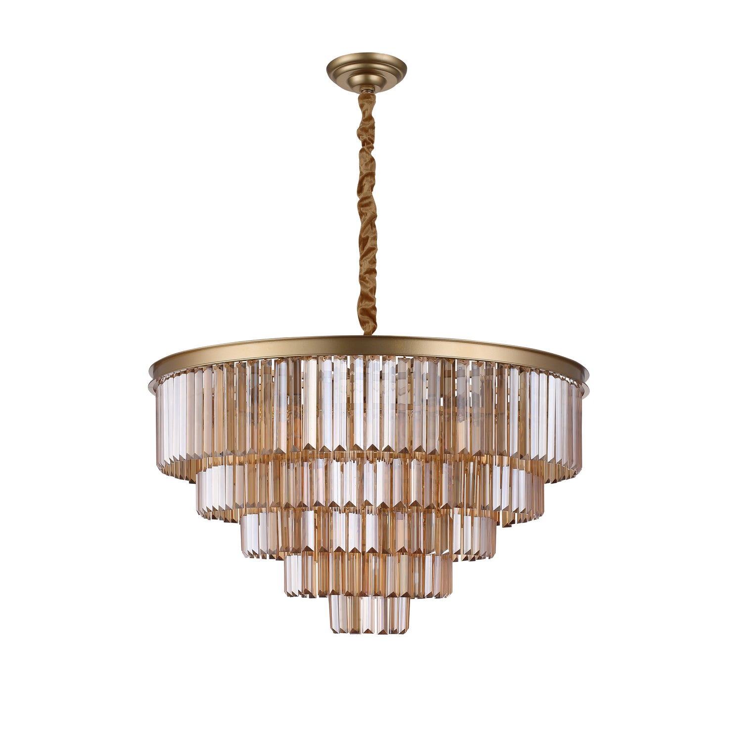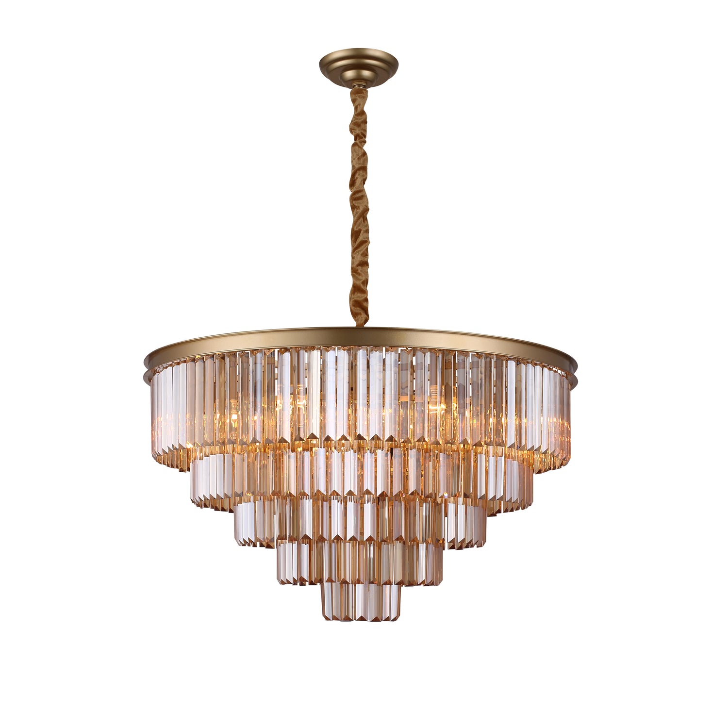 Prismene i glass er arrangert i en vakker kaskadeform som både reflekterer og sprer lyset med en spesiell varme og dybde. Santorini fås i tre elegante farger – klar, amber og smoke – slik at du enkelt kan finne en variant som passer til din innredning. Den gyldne metallrammen og stoffkledde ledningen understreker lampens høye finish og skaper en helhetsopplevelse av kvalitet og stil.